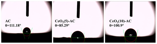 According to the analysis of Figure 4 and Figure 7, the contact angle of the activated carbon electrode is 111.18°, which is a hydrophobic material, while the contact angle of the CeO2(5)-AC electrode is 85.29°, which is a hydrophilic material. The increase in hydrophilic energy can make it easier and faster for ions to diffuse into the electrode, thereby improving the electro-adsorption performance and obtaining good capacitance. However, when the CeO2 doping mass ratio was increased to 10 wt%, the electrode contact angle was 100.9°, which may be due to the aggregation of CeO2 fine particles on the AC surface and accumulation in the pores, which can be observed in the SEM images.