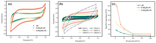 (a) CV curves of AC, CeO2(5)-AC and CeO2(10)-AC electrodes at a 5 mV/s scanning rate. (b) CV curves of the CeO2(5)-AC electrode at different scanning rates (5 mV/s, 10 mV/s, 30 mV/s, 50 mV/s, 100 mV/s, and 200 mV/s). (c) The specific capacitance curves of AC, CeO2(5)-AC and CeO2(10)-AC electrodes at different scanning rates.