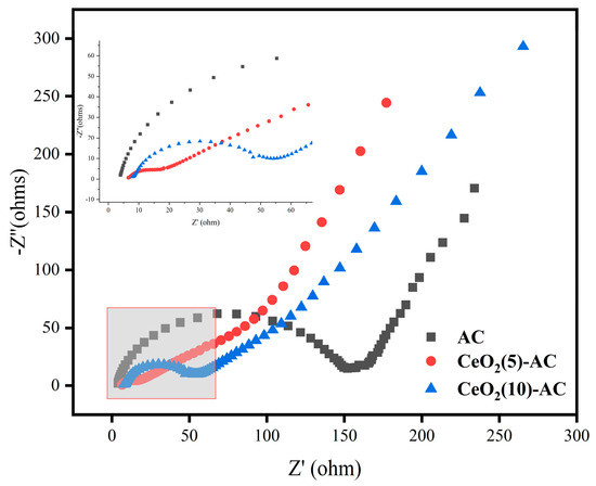 Nyquist diagram of AC, CeO2(5)-AC, and CeO2(10)-AC.