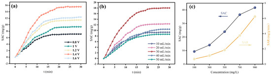 The optimal process parameters were determined by exploring the influences of changes in voltage, inlet flow rate, SO42− initial concentration, and other parameters on the CDI performance of the CeO2(5)-AC electrode, and the results are illustrated in Figure 11a–c.