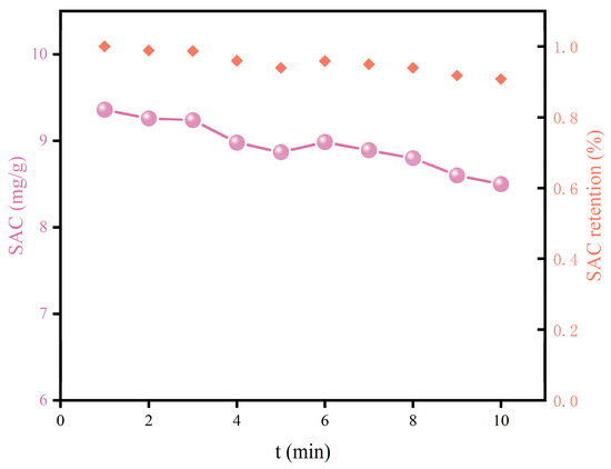 The number of electrode material adsorption and desorption cycles is a key factor in electrode performance and operation costs. In this experiment, the SAC value and SAC retention rate were examined while the electrode was undergoing adsorption and desorption 10 times. The results are shown in Figure 12.