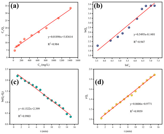 The adsorption behavior of SO42− on the electrode material was analyzed using adsorption isotherms and adsorption kinetic models, and the results are shown in Figure 13a–d and Table 3. The isotherm and kinetic equations are shown below.