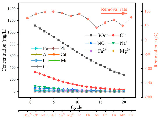 As shown in Figure 13, after 20 cycles, the concentration of SO42− in effluent water decreased from 1170 mg/L to 276.46 mg/L, and the removal rate was 76.37%. The adsorption capacity of SO42− in actual mine water by the CeO2(5)-AC electrode is lower than that in the Na2SO4 solution. The reason is that the mine water not only contains SO42− but also contains other salt ions and heavy metals, which form competitive adsorption with SO42−. After CDI treatment, the NO3− concentration decreased from 67 mg/L to 1.34 mg/L, and the removal rate was 98%. The concentration of Cl− decreased from 342 mg/L to 27.36 mg/L, with a removal rate of 92%. In addition, after CDI treatment, the concentrations of heavy metals in mine water also decreased, and the removal rates of the heavy metals Fe, Pb, As, Cd, Cu, Mn, and Cr were 72.8%, 43%, 63.12%, 71.26%, 50.25%, and 79.62%, respectively. The test results show that the CeO2 activated carbon electrode capacitance method can effectively remove sulfate and co-existing ions from mine water.