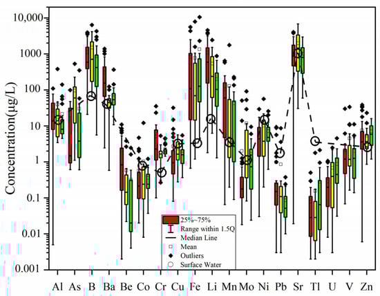 Trace-element concentrations in the water samples in the XSHF-XJF. The red color stands for the samples from the XSHF, yellow color for the samples from the AZF, and green color for the samples from the XJF. Surface water data are taken from the mean values of the content of the element.