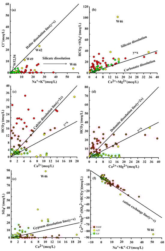 In the Na+ + K+ − Cl− vs. (Ca2+ + Mg2+) − (SO42− + HCO3−) diagram (Figure 5f), most of the samples are scattered along the 1:1 line, hinting that the cation-exchange process between deep fluids and secondary silicate minerals (e.g., kaolinite, illite, montmorillonite, etc.) may affect the chemical composition of the water. But, water sample 46 is not significantly affected by cation exchange (Figure 5f). It is the Na-SO4 type that is exposed in granite. The high concentrations of Na+ (Figure 5a) come from the hydrolysis of silicates at high temperatures, and high concentrations of SO42− (Figure 5b,e) come from the oxidation of sulfides (e.g., pyrite) in granite.