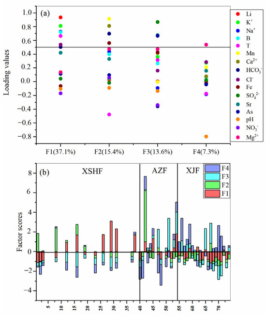 (a) Results of factor analysis of hydrochemical parameters; (b) distribution of factor scores of water samples in the XSHF-XJF.