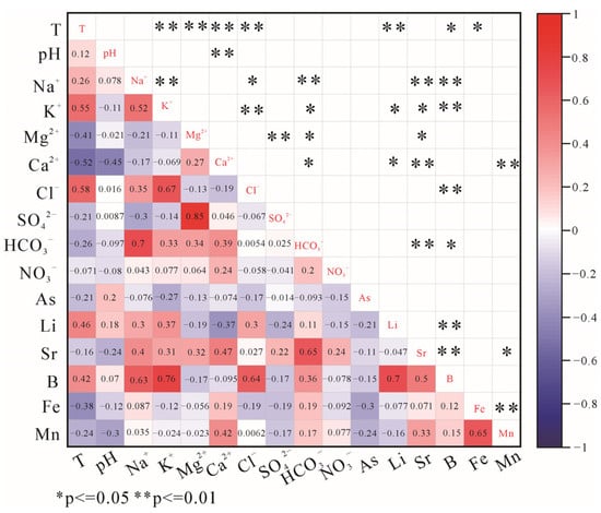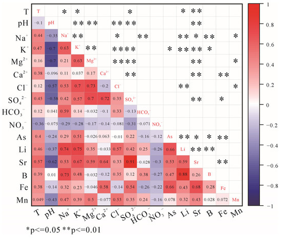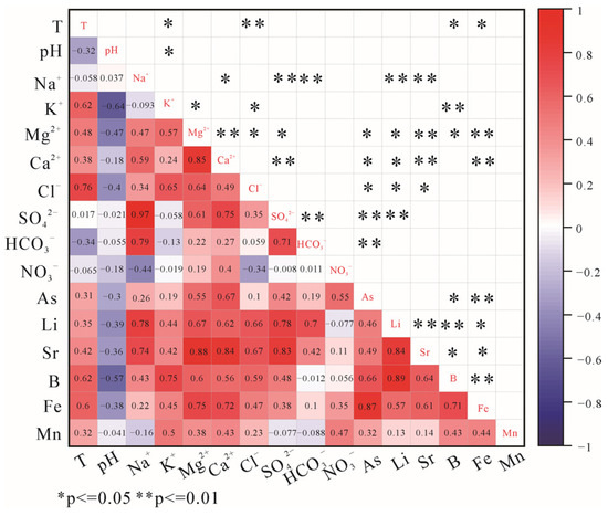 The concentrations of Fe and Mn in the hot springs show large variability, ranging from 0.662 to 5569 μg/L, and 0.065 to 6424 μg/L, respectively. The No.4 water sample contains the highest Fe concentration (5569 μg/L), and No.8 has the highest Mn concentration (642 μg/L). A high concentration of Fe in water samples may related to groundwater flowing through iron deposits in the Triassic strata in the area [61,62]. The water samples, being supersaturated for goethite and hematite, also support the high content of Fe in hot springs. Manganese correlates positively with Fe (r = 0.65) (Figure 7), indicating that they may be concomitant. The concentrations of Sr range from 0.019 to 4016 μg/L. Strontium correlates positively with Ca2+ (r = 0.47), Mg2+ (r = 0.32), HCO3− (r = 0.65), and Na+ (r = 0.40) (Figure 7), suggesting that the dissolution of Sr-bearing minerals in granite and carbonate rocks may provide a large amount of Sr for the hot-spring waters.