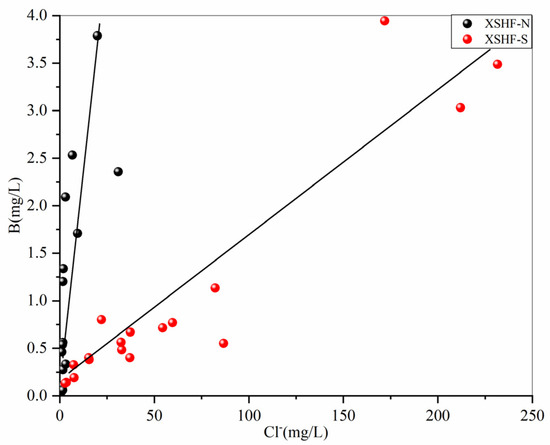 Plot of B vs. Cl in the hot-spring waters in the XSHF.