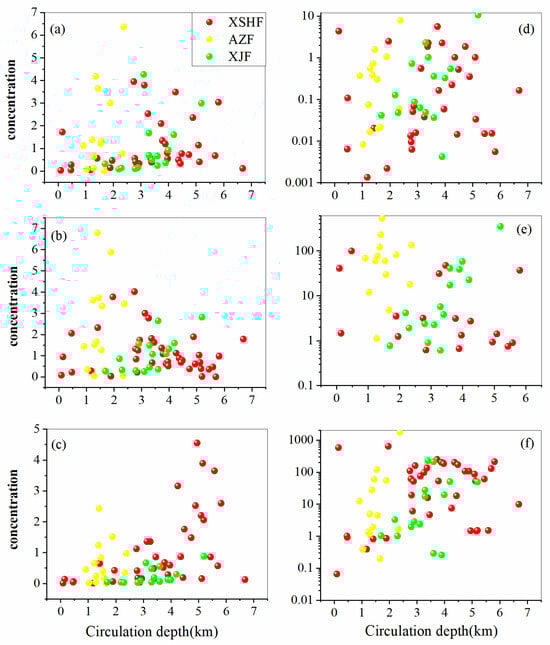 The concentrations of trace elements in geothermal waters are usually influenced by the circulation depth controlled by faults, resulting in a vertical distribution [67]. Figure 11 illustrates the relationship between circulation depth and trace-element concentration. The concentrations of B and Li increase with the increasing circulation depth of hot-spring waters. Strontium concentrations show a positive trend with circulation depth in the XJF, while it has a negative trend with circulation depth in the XSHF (Figure 11b). The geothermal reservoirs in the XSHF present dual structure characteristics [26]. Deep geothermal water, enriched with elements such as Na, K, and Li, is primarily associated with granite reservoirs. Whereas, shallow geothermal water is associated with limestone reservoirs, with high concentrations of Ca and Mg [68]. Therefore, with a shallower circulation depth, the chemical composition is significantly influenced by carbonate rocks, and Sr concentrations are higher owing to the stronger affinity between Sr and Ca. As for the concentration of Fe, Mn, and As, they are not significantly controlled by the circulation depth, except in the XJF, which may be affected by other factors (e.g., dissolution and precipitation of minerals, adsorption and desorption, etc.) [69]. The circulation depth of hot springs in the AZF is generally low, and the concentrations of trace elements are highly variable because of the complex geological conditions in this area. As mentioned above, the circulation depth of hot springs can affect the trace-element concentration, especially B and Li. Deep circulation of thermal waters would promote the upwelling of deep geothermal fluids and enhance water–rock interactions, which in turn affects their concentrations.