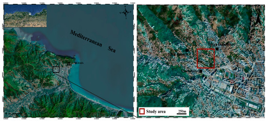 The landslide occurred in Targa Ouzemour village, situated in the southern region of Béjaïa prefecture (Wilaya) (Northeast Algeria) and about 180 km east of the Algerian capital, Algiers. Nowadays, the Targa Ouzemour landslide remains one of the main urban hazards, which threatens this southern sector of Béjaïa city (Figure 1). More precisely, it is bounded towards the North and East by Targa Ouzemmour village, southwards by Abd Arahmane Mira University, and to the West by Ighil Batagh village. As a consequence of the landslide, considerable damage has occurred to the surrounding infrastructure and threatens the entire region. The affected area extends over approximately 6 Ha. However, the most severely affected infrastructures include the university campus of Béjaïa “Abd Arahmane Mira University”, in particular its upstream part and the downstream side of the university residence of “Targa Ouzemmour”, adjacent to the campus (Figure 2).