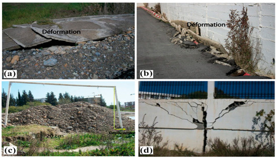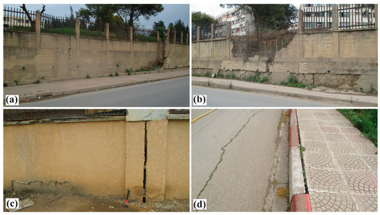 From field observations, the slope inclination is between 15° and 35°, generally NE–SW oriented, with transverse cracks and subsidence. Owing to this geometrical configuration and its location in the rainiest region (~900 mm/year), this unstable slope is affected by serious excavations and increased erosion caused by surface water flows. In addition, the landslide is accentuated especially during the winter period. The hydrographic network disturbance and the movement of groundwater from various sources are the most serious aggravations. This has resulted in severe damages, which affected above-ground structures. Several signs of deformation are observed with cracks and joint openings in the blocks, and structure shearing such as holdings, sidewalls and roads due to the traction forces generated by the soil movement. The best example of deformation indicating the landslide evolution is the deformation observed on the wall surrounding the University Residence extending about 150 m beyond this unstable area (Figure 5a,b). In the landslide zone, we have observed significant scarps of about 20 cm to 40 cm, minor scarps, depressions, subsidence and fissures inside the university residence (Figure 2 and Figure 5). Based on field observations and deformations, two types of movement characterize this landslide area. The first one can be identified by the rupture marks and the downstream ridge (Figure 2). The second one has a creep character, indicating the upstream evolution of the sliding movement. During the rainy season, these deformations are accentuated by the influx of water and the reduction in the shear strengthening characteristics of the soil. Moreover, in the upstream part, the measured length of the scarp is about 90 m, which presents a creep deformation curvature over 120 m length (Figure 5c,d).