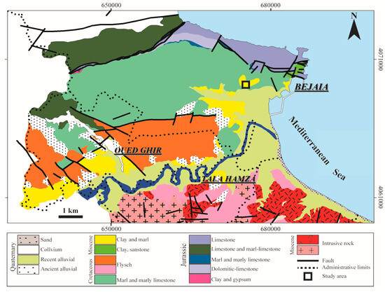 Geologic context of Bejaia city (extracted from the Geologic Map of the Béjaia region e = 1/50,000).