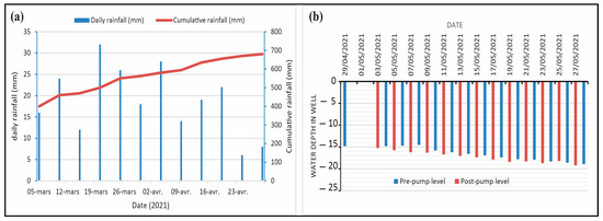 (a) Cumulative precipitation effects on (b) groundwater regeneration monitored before and after pumping periods in the domestic well for the period from during the month of May.