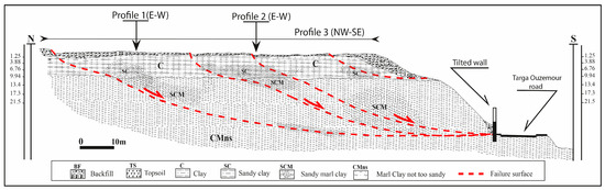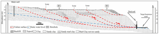 Once combining all the extracted information from the three drawn sections and the geotechnical interpretation, a synthesized NS-oriented geological-geotechnical section in the direction of the landslide was lastly produced with different groundwater levels (Figure 13). This section reflects a “geomodel” representation of the deep lithological composition within the in situ landslide area. On this proposed geomodel features is shown an over 10 m thick lens of sandy marly clay. The latter developed laterally and downward within a marly clay type layer. Several smaller lenses of a sandy clay nature that are developed in the clay layer come close to this thick lens. Consequently, these different lenses delineate the failure surfaces, thus characterizing the upstream sliding progression. Another implication would be that the feeding of these lenses occurs through the deep infiltrations of sewage or rainwater seeping from the surface. In this way, the saturation process and increased interstitial pressure at depth will make all these layers less resilient simultaneously.