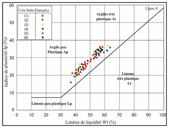 The mean values of some parameters of the samples obtained from the different boreholes that cover the landslide zone are presented in Table 2. They show a variable distribution of the geotechnical parameters in the different boreholes. The liquidity limit and the plasticity index values of the samples obtained from different depths of the core drillings vary between 37% and 69% and also between 16% and 37%, respectively. The Casagrande table shows that these samples’ nature generally goes from slightly to very plastic. These results illustrate that the Targa Ouzemmour landslide affects a slope that consists of clay overall.