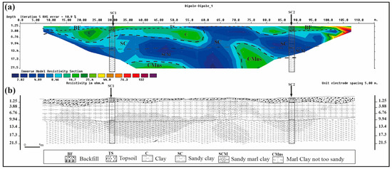 (a) The model of resistivity inversion and (b) geological-geotechnical cross-section along the profile lines P1.