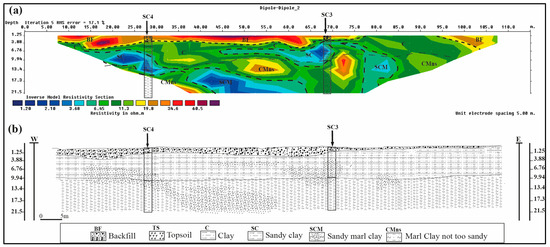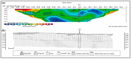 (a) The model of resistivity inversion and (b) geological-geotechnical cross-section along the profile lines P3.