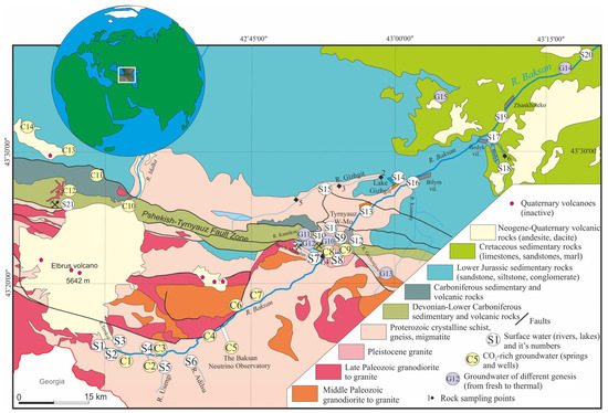The Great Caucasus and Elbrus volcano are international tourist destinations, a home for many local people, and a region rich in mineral resources. Approximately 300,000 people visit Mount Elbrus volcano and its surroundings, which are rich in mineral springs and waterfalls, annually [1]. The Tyrnyauz deposit, the largest W-Mo skarn deposit in Russia is also located here. After the liquidation of the Tyrnyauz mining complex at the end of the 20th century, the mines and quarries are in an abandoned state and have been sources of natural water pollution for more than thirty years (e.g., [2]). The Baksan River is the biggest river in the region and originates from the glaciers in the Elbrus volcano and accepts all streams from ore mines, tailing storages of Tyrnyauz deposits, and numerous settlements. The contamination of soil and water by heavy metals is one of the biggest problems related to abandoned mine sites. But except for anthropogenic activities, other factors, such as natural water from deep horizons that were not considered earlier, may also pose a greater risk to human populations in the area.