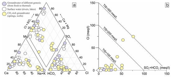 Figure 2b shows that the chemical features of several CO2-rich waters, which have a total ionic salinity of 100–300 meq/L, were acquired at deep levels through the water-rock interaction. The dominance of Na+ over Ca2+ and Mg2+ in these samples can also indicate ion exchange processes. In the case of other CO2-rich waters and other groundwaters, their majority present a TIS between 0 and 100 meq/L and low Na/K ratios. This low salinity indicates that waters come from shallow depths.