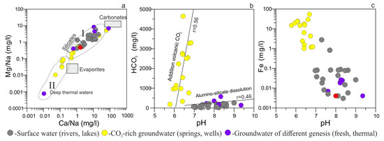 Na-normalized mixing diagrams Ca/Na versus Mg/Na (a); a scatter plot of HCO3 versus pH (b); and (c) correlations between pH and Fe concentrations in the studied water. The end members of carbonates, silicates, and evaporates are from [43].