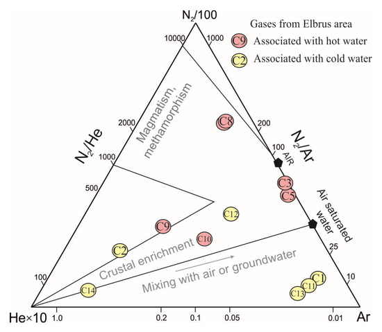 Mineral CO2-rich waters are the groundwaters that get an additional excess influx of CO2. The large amount of CO2 may be from mantle-magma degassing or thermal metamorphism of carbonate rock [15,17]. In our case, information on gas genesis may indicate both the permeability of rocks and the confinement of groundwater to deep tectonic faults. Carbon dioxide (75–99 vol.%) and nitrogen (up to 21 vol.%) are the main components of the gases in the fluids. According to high N2/He and low He/Ar ratios, some gases (#C1, C11, and C13) were identified as air-contaminated (Figure 4). The location of the samples (#C3 and C5) points to the air mixture as the gases are rising to the surface. Figure 4 shows that at site #C8, the N2/Ar ratios are higher than the air value. This means that the N2 is coming from somewhere other than the atmosphere, like gases from igneous and metamorphic basement rocks.