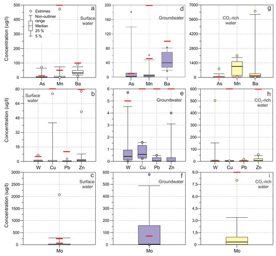 Box plots of the heavy metals concentrations statistical distribution in the surface (a–c), groundwater (d–f) and mineral waters (g–i) of Elbrus area. The red line represents the degree of limitation for drinking water specified by WHO guidelines [35,47] (see Table S1).