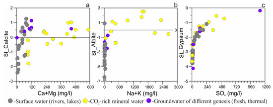 First, group (I) waters are characterized by Ca/Na ratios ranging from 0.006 to 5.60, pointing to silicates and carbonates as the main sources of dissolved ions in all surface waters, some CO2-rich, and mining water (Figure 3a; Table S1). Only two springs (#G15, C12) with high Ca/Na ratios (from 33.7 to 46.9) lie close to the carbonate end member. But calcite is ubiquitous in all types of rocks, even crystalline ones [44]. Second group is deepest thermal waters which genesis can be connected with carbonate weathering or cation exchange, as demonstrated by TIS data (Figure 2b).