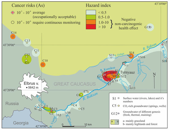 The concentrations of Mn (2.1 mg/L), Ba (5.9 mg/L), Pb (16.3 mg/L), W (0.5 mg/L), and As (0.8 mg/L) in CO2-rich mineral water are higher than the WHO’s permitted limit standard for drinking water. Maximum levels of Mn, Mo, Zn, and As, in stream water were 0.47 mg/L, 2.07 mg/L, 0.37 mg/L and 0.07 mg/L, respectively. According to the results of executed risk assessment, the toxic risk (HI) value in river waters was less than 1, while the value for mining water was 116. In particular, HQ values for As and Mo in mining water of the region were 15 and 107 respectively. These areas that have been shown to have a high risk of adverse non-carcinogenic health effects are mainly located within the Tyrnyauz mining zone, as well as on the north of the Elbrus area.