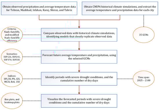 - Utilization of CMIP6 GCMs: This study stands out by utilizing the advanced capabilities of CMIP6 multi-model simulations, which represent the latest generation of climate models. Very few studies have incorporated CMIP6 GCMs due to their recent development. By employing these cutting-edge models, this research contributes to advancing the understanding of climate dynamics and their implications for severe drought in Iran’s metropolises.