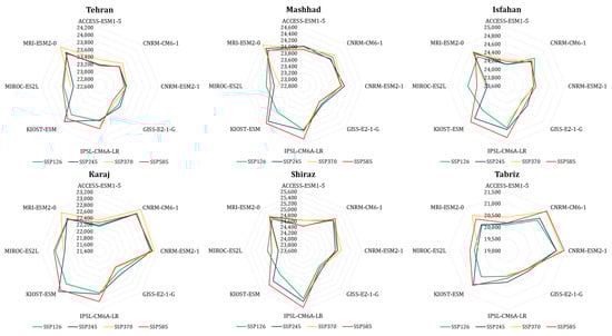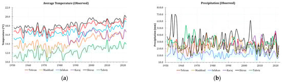 These cities’ varying climates are a reflection of Iran’s climatic diversity, influenced by its vast topography and geographical location. The geographic locations of these metropolises are shown in Figure 2. The observed records of daily precipitation and average temperature data were acquired from the Islamic Republic of Iran Meteorological Organization [], spanning from 1951 to 2023 for Tehran, Mashhad, Isfahan, Shiraz, and Tabriz, and from 1985 to 2023 for Karaj, due to the availability of the data.