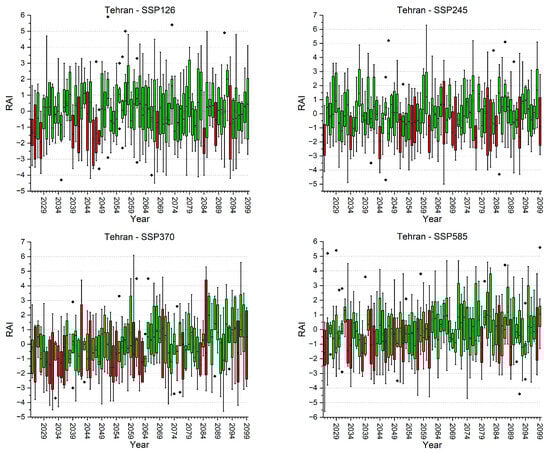 The following box plots show the drought index values, based on the SPI, DI, PN, CZI, MCZI, RAI, and ZSI indices, for Tehran, Mashhad, Isfahan, Karaj, Shiraz, and Tabriz, under the SSP126, SSP245, SSP370, and SSP585 scenarios.