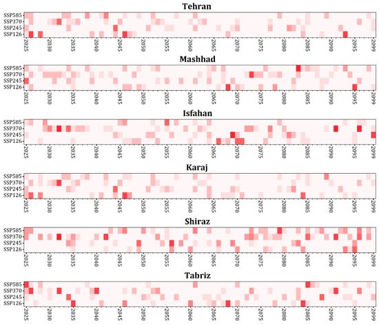 The results derived from the application of the M-K test are presented in Table 3. The statistical evidence provided by the test further substantiates the visual trends observed in the figures, thus offering a comprehensive view of the climatic trends that are shaping the environment of these significant Iranian urban centers. According to Table 3, at a 95% confidence interval, all cities exhibited positive Z values, indicating a clear upward trend in temperatures, consistent with the general expectations of global warming patterns. In contrast, the precipitation data presented a more complex picture. At the same 95% confidence interval, only the city of Tabriz demonstrated a statistically significant trend, which was a decrease in precipitation. This downward trend aligns with concerns over increased aridity and water scarcity issues in the region. However, when considering confidence intervals other than 95%, the Z values suggested varied trends for precipitation in other cities. Specifically, Tehran and Isfahan showed upward trends in precipitation, whereas Mashhad, Karaj, and Shiraz exhibited downward trends. These mixed results indicate that precipitation patterns are less consistent than temperature trends and may be influenced by a range of local and regional factors, such as geography, urban development, and atmospheric conditions.