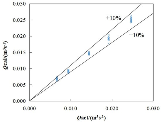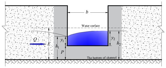 In experiments when the upstream weir head was over 30 mm, the effects of surface tension on discharge were found to be minor []. The viscosity effect was far less than the gravity effect in a turbulent flow. Hence μ and σ were excluded from the analysis [,]. In addition, the channel width, the channel slope, and the fluid density were all constant, so the discharge formula can be simplified as: