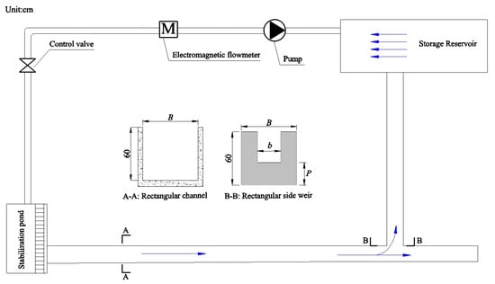 The experimental setup contained a storage reservoir, a pumping station, an electromagnetic flow meter, a control valve, a stabilization pond, rectangular channels, a side weir, and a sluice gate. The layout of the experimental setup is shown in Figure 2. Water was supplied from the storage reservoir using a pump. The flow discharge was measured with an electromagnetic flow meter with precision of ±3‰. Water depth was measured with a point gauge with an accuracy of ±0.1 mm. The flow velocity was measured with a 3D Acoustic Doppler Velocimeter (Nortek Vectrino, manufactured by Nortek AS in Rud, Norway). In order to eliminate accidental and human error, multiple measurements of the water depth and flow velocity at the same point were performed and the average values were used as the actual water depth and flow velocity of the point. The main and side channels were both rectangular open channels measuring 47 cm in width and 60 cm in height. The geometrical parameters of rectangular side weirs are shown in Table 1.