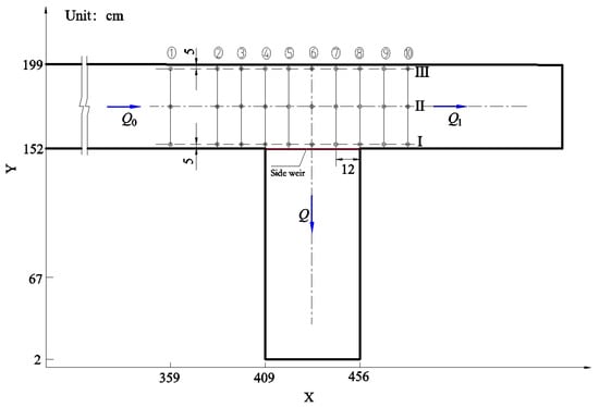 When water passes through a side weir, its quality point is affected not only by gravity but also by centrifugal inertia force, leading to an inclined water surface within that particular cross-section before reaching the weir. In order to examine water profiles adjacent to side weirs, cross-sectional measurements were conducted at regular intervals of 12 cm both upstream and downstream of each side weir, denoted as sections ① to ⑩, respectively. Measuring points were positioned near the side weir (referred to as “Side I”), along the center line of the main channel (referred to as “Side II”), and far away from the side weir (referred to as “Side III”) for each cross-section. The schematic diagram illustrating these measuring points is presented in Figure 3.