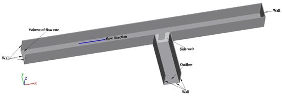 To streamline the iterative calculation and minimize simulation time, we selected a main channel measuring 7.5 m in length and a side channel measuring 2.5 m in length for simulation. Three-dimensional geometrical models were developed using the software AutoCAD (version 2016-Simplified Chinese). The spatial domain was meshed using a constructed rectangular hexahedral mesh and each cell size was 2 cm. A volume flow rate was set in the channel inlet with an auto-adjusted fluid height. An outflow–outlet condition was positioned at the end of the side channel. A symmetry boundary condition was set in the air inlet at the top of the model, which represented that no fluid flows through the boundary. The lower Z (Zmin) and both of the side boundaries were treated as a rigid wall (W). No-slip conditions were applied at the wall boundaries. Figure 4 illustrates these boundary conditions.