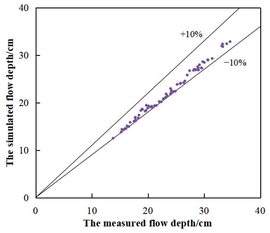 Water surface profiles were crucial parameters for selecting water-measuring devices. Upon analyzing the consistent patterns observed in different conditions, one specific condition was chosen for further analysis. To validate the reliability of numerical simulation, measured and simulated water depths of rectangular side weirs with different widths and heights at a discharge rate of 25 L/s were extracted for comparison (Table 2 and Figure 5). The results in Table 2 and Figure 5 indicate a maximum absolute relative error value of 9.97% and all absolute relative error values within 10%, demonstrating satisfactory agreement between experimental and simulated results.