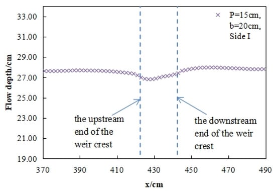 Water surface profile on Side Ⅰ with a side weir width of 20 cm and height of 15 cm at a discharge of 25 L/s.