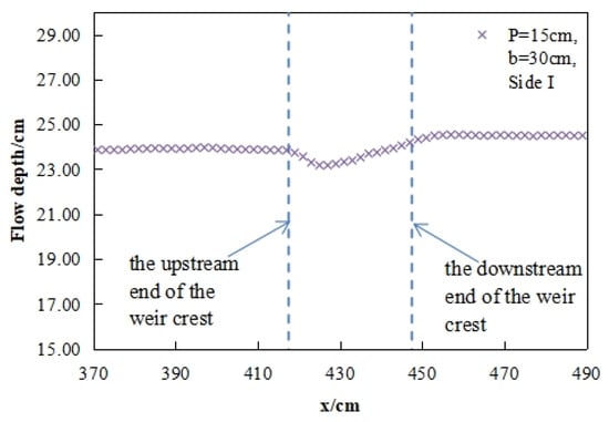 Water surface profile on Side Ⅰ with a side weir width of 30 cm and height of 15 cm at a discharge of 25 L/s.
