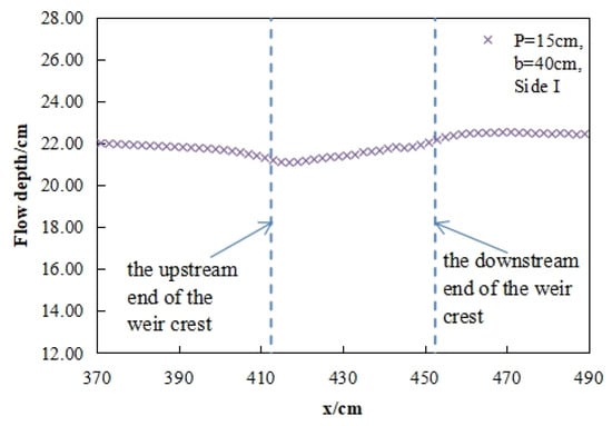 Water surface profile on Side Ⅰ with a side weir width of 40 cm and height of 15 cm at a discharge of 25 L/s.