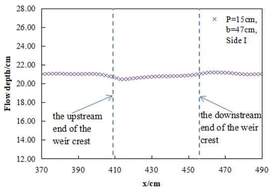 According to Figure 7, Figure 8, Figure 9 and Figure 10, the water depth upstream of the main channel started to decrease as it approached the upstream end of the weir crest and then gradually increased at the weir crest section. In other words, the water surface profile exhibited a backwater curve along the length of the weir crest. The water depth remained relatively stable downstream of the main channel within a certain range from the downstream end of the weir crest. Additionally, there was a higher water depth downstream of the main channel compared to that upstream of the main channel. Furthermore, an increase in the width of the side weir led to a gradual reduction in fluctuations on its water surface.