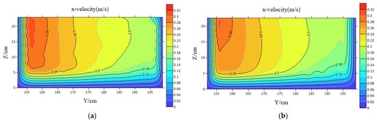 Velocity distribution in the x-direction of section ④: when the discharge is 25 L/s, the height of the side weir is 15 cm and the width of the side weir is 30 cm. (a) Measured velocity distribution; (b) Simulated velocity distribution.