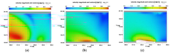Distribution of flow velocity at different depths with a side weir width of 30 cm and height of 15 cm at a discharge of 25 L/s. (a) z/P = 0.3; (b) z/P = 0.8; (c) z/P = 1.6.