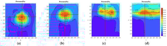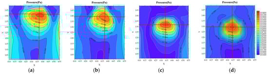 Comparison of pressure distribution on the bottom plate of the side channel with different widths of side weirs when the discharge is 25 L/s and the height of side weirs is 20 cm. (a) P = 20 cm, b = 20 cm; (b) P = 20 cm, b = 30 cm; (c) P = 20 cm, b = 40 cm; (d) P = 20 cm, b = 47 cm.