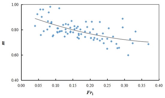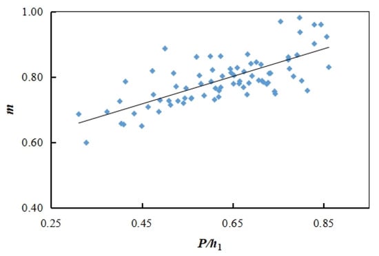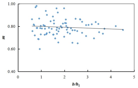 Based on dimensionless analysis, the influencing parameters of the discharge coefficient were obtained. To study the effect of parameters Fr1, b/h1, and P/h1, discharge coefficient values were plotted against Fr1, b/h1, and P/h1, shown in Figure 15, Figure 16 and Figure 17. The discharge coefficient decreased as parameters Fr1 and b/h1 increased. The discharge coefficient increased as parameter P/h1 increased. As Uyumaz and Muslu reported in a previous study, the variation of the discharge coefficient with respect to the Froude number showed a second-degree curve for a subcritical regime [].
