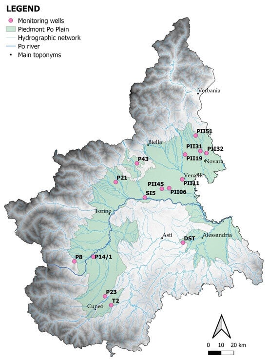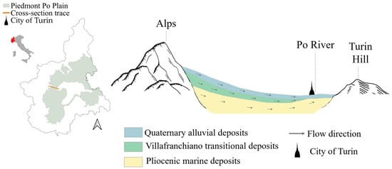 From a hydrogeological perspective, the Piedmont Po Plain consists of three hydrogeological units (Figure 1). Starting from the top, Quaternary alluvial deposits (lower Pleistocene-Holocene) hosting a shallow, unconfined aquifer are present. Below, Villafranchiano transitional deposits (late Pliocene–early Pleistocene) host a multilayered aquifer. Finally, Pliocene marine deposits (Pliocene) host a confined aquifer [,,]. Due to its geological features and considerable size, the Piedmont Po Plain is recognized as the most significant groundwater reservoir in the Piedmont region [].
