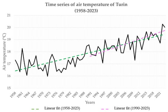 Time series of annual average air temperature data for the city of Turin for the period of 1958–2023. Dashed coloured lines represent the linear fit for different time periods: green 1958–2023; pink: 1990–2023.
