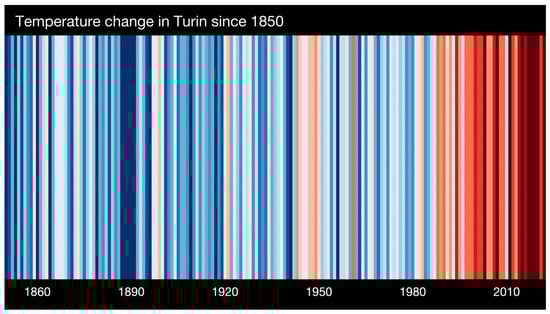 In addition, the Global Warming Stripes database [], consulted for the city of Turin as the capital of the Piedmont Region, permitted the analysis of how the AT anomalies have varied since 1850 (Figure 3). Warming stripes highlight a clear increase in the anomaly value since 1990, confirming an increase in AT due to CC.