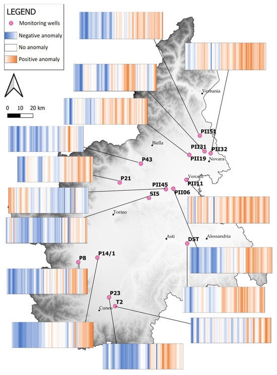 Finally, the utilization of monthly anomalies served as an advantageous strategy for highlighting trends in short historical series. Indeed, in the Piedmont Plain case study, the annual average anomaly for the period 2010–2022 in each monitoring well yielded only 13 stripes. However, employing monthly anomalies allowed for the creation of 156 bands, providing a more comprehensive mean for assessing the variation in anomalies.