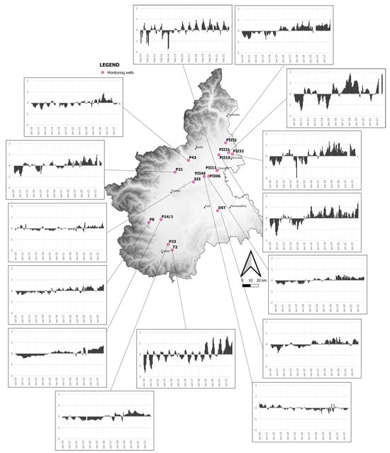 Only one piezometer, PII45, showed a decrease in anomalies in recent years, linked to a decrease in GWT over the observed time period. This piezometer was located within an industrial area where there was a thermoelectric power plant. For this reason, interpreting these results was difficult since they could be connected to the impact of anthropogenic activities carried out on the surface rather than to the impact of CC. For this reason, the data from these monitoring points will be further analysed in future studies to better understand their different behaviours compared with those of the other monitoring wells in the Piedmont Plain.